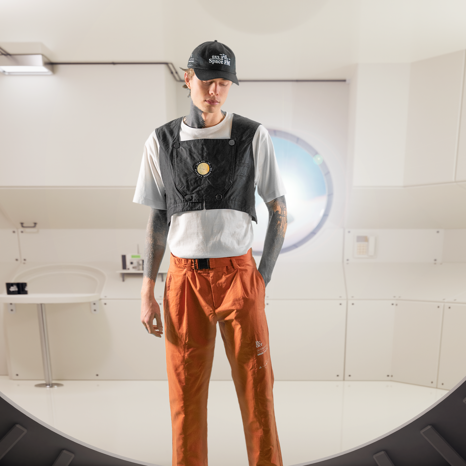 Cropped space-inspired vest with technical details. Removable chest patch with embroidered patch and hidden pockets. Heavy zipper and 3D cargo pockets at front and back with tonal embroidery. Full body lining inside.